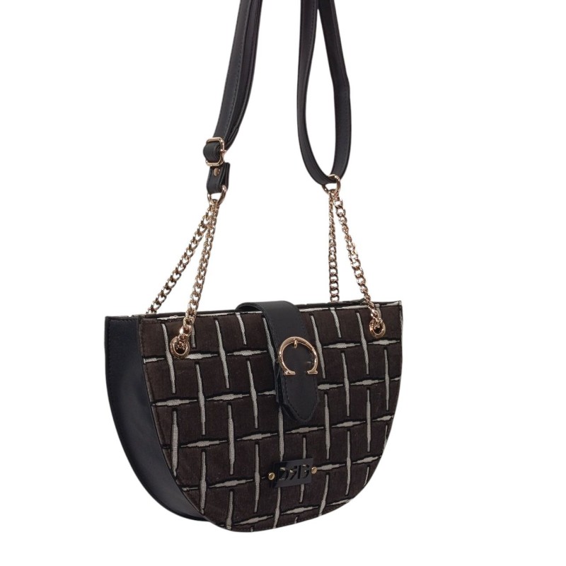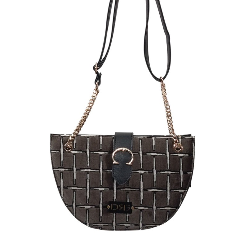 The Grid Luna shoulder bag is inspired by the geometry of the moon—semi-circular, refined, and subtly striking. Handcrafted in Greece from velvety fabric with leather lining, it features gold chain details, a minimal flap with secure zipper, and a metallic DRG logo. Measuring 24 × 30 × 9 cm, it combines minimalist elegance with practical style.