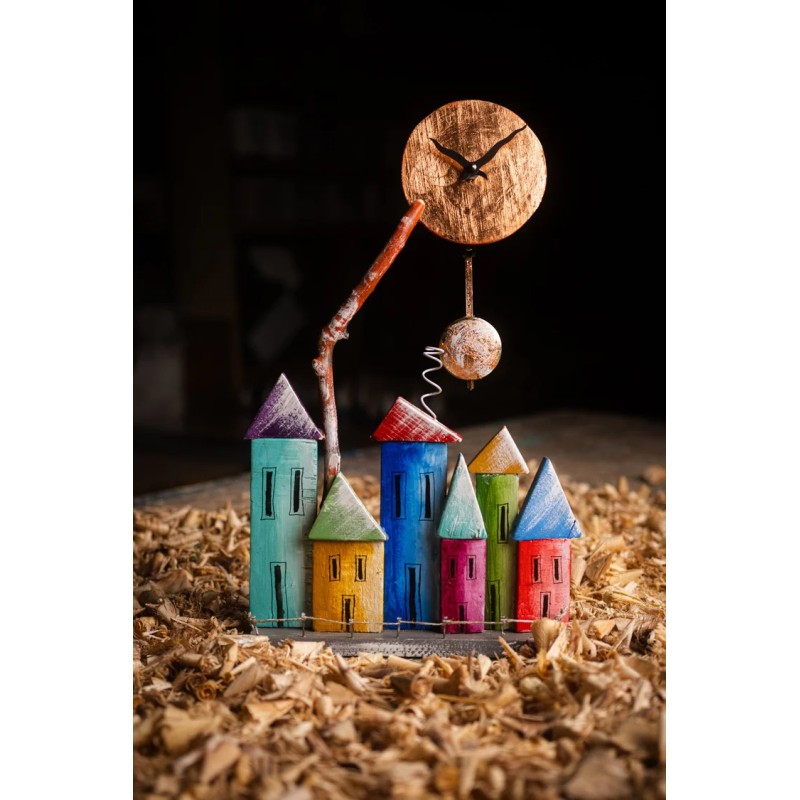 Wooden Clock with 6 Houses & Pendulum Multicolour